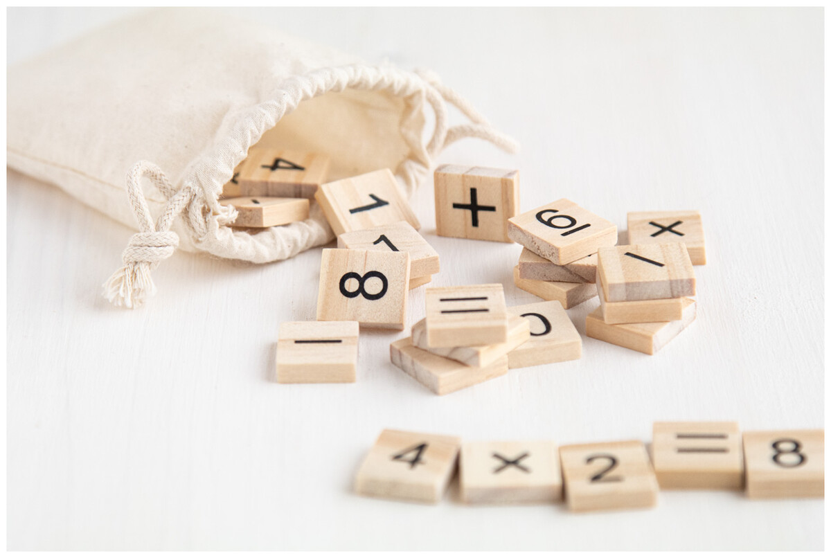 Dřevěná vzdělávací hra na počítání v bavlněném sáčku se stahovací šňůrkou. S 32 dílky, včetně čísel a matematických operací.