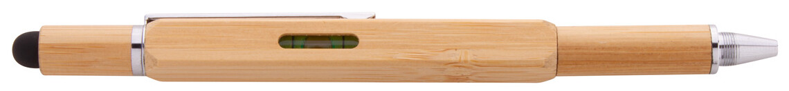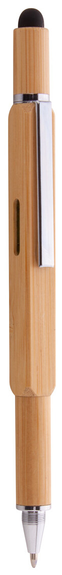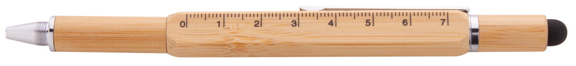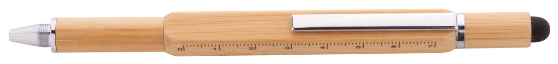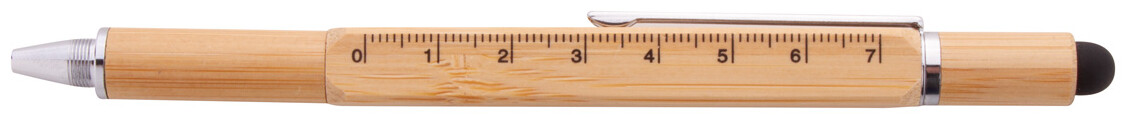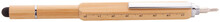 Multifunkční otočné kuličkové a dotykové pero z bambusu. S oboustranným šroubovákem, vodováhou a pravítkem 7 cm. S modrou náplní.