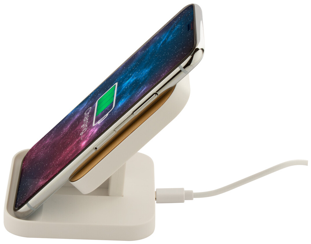 Recyklovaný stojánek na mobil z ABS s bambusovou vestavěnou bezdrátovou rychlonabíječkou (15W). Včetně USB nabíjecího kabelu.