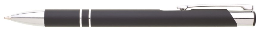 Hliníková propiska se stříbrnými doplňky a měkkým pogumovaným soft povrchem v černé barvě. Modře píšící.