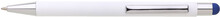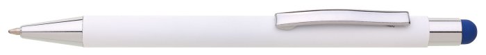 Bílá kovová propiska se soft povrchem a modrým touch koncem. Logo po vylaserování je v barvě touch – leskle modré.