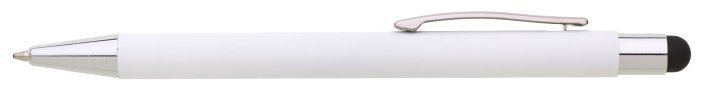 Bílá kovová propiska se soft povrchem a černým touch koncem. Logo po vylaserování je v barvě touch – leskle černá.