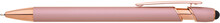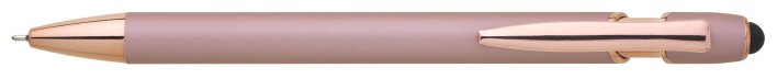 Kovová propiska se soft povrchem, touch koncovkou a doplňky v růžovo-zlaté barvě. Laserované logo je lesklé, růžovo-zlaté. Náplň semigelová, modře píšící.