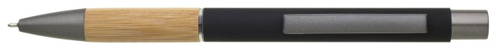 Kovová propiska s hnědo-černými doplňky, pogumovaným povrchem a bambusovým úchopem. Náplň semigelová s mikrohrotem.
