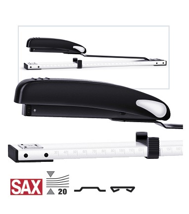 Sešívač s dlouhým ramenem. Sešívací výkon 20 listů papíru, hloubka vložení 300 mm, spony 24/6 a 26/6, Možnost pevného či volného sešití. Barevné provedení: černé.