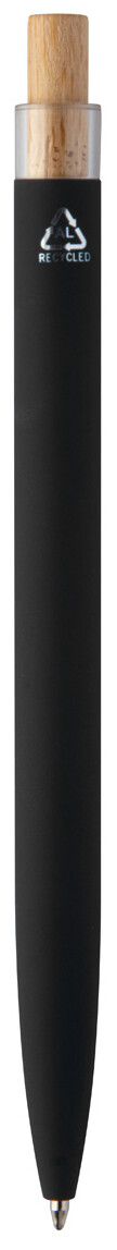Kuličkové pero z recyklovaného hliníku s pogumovaným povrchem, bambusovým tlačítkem a chromovým klipem. Se speciální vrstvou pro zrcadlové laserové gravírování. S modrou náplní.
