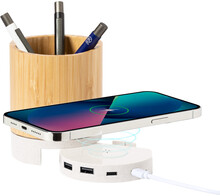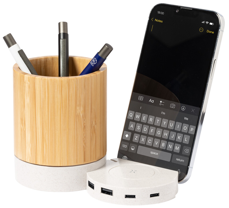 Multifunkční držák na pera z bambusu a ekologického plastu z pšeničné slámy. S držákem na mobilní telefon, bezdrátovou nabíječkou (5W) a 3portovým USB hubem (2 USB a 1 USB-C porty, USB 2.0). Včetně USB nabíjecího kabelu.