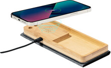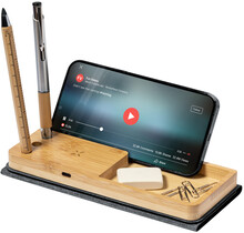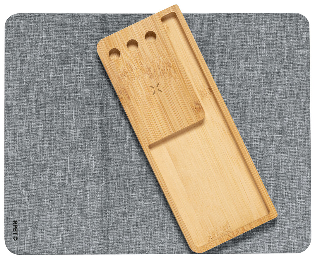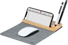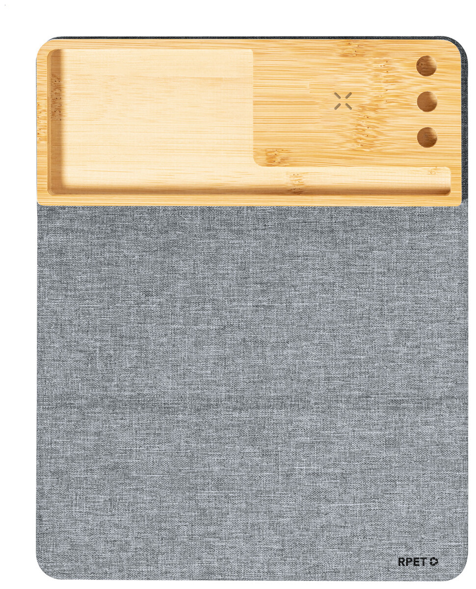 Skládací polyesterová podložka pod myš RPET se silikonovou základnou. S vestavěnou bezdrátovou rychlonabíječkou (15W) a bambusovým držákem mobilního telefonu. Polyester 300D RPET. Včetně USB nabíjecího kabelu.
