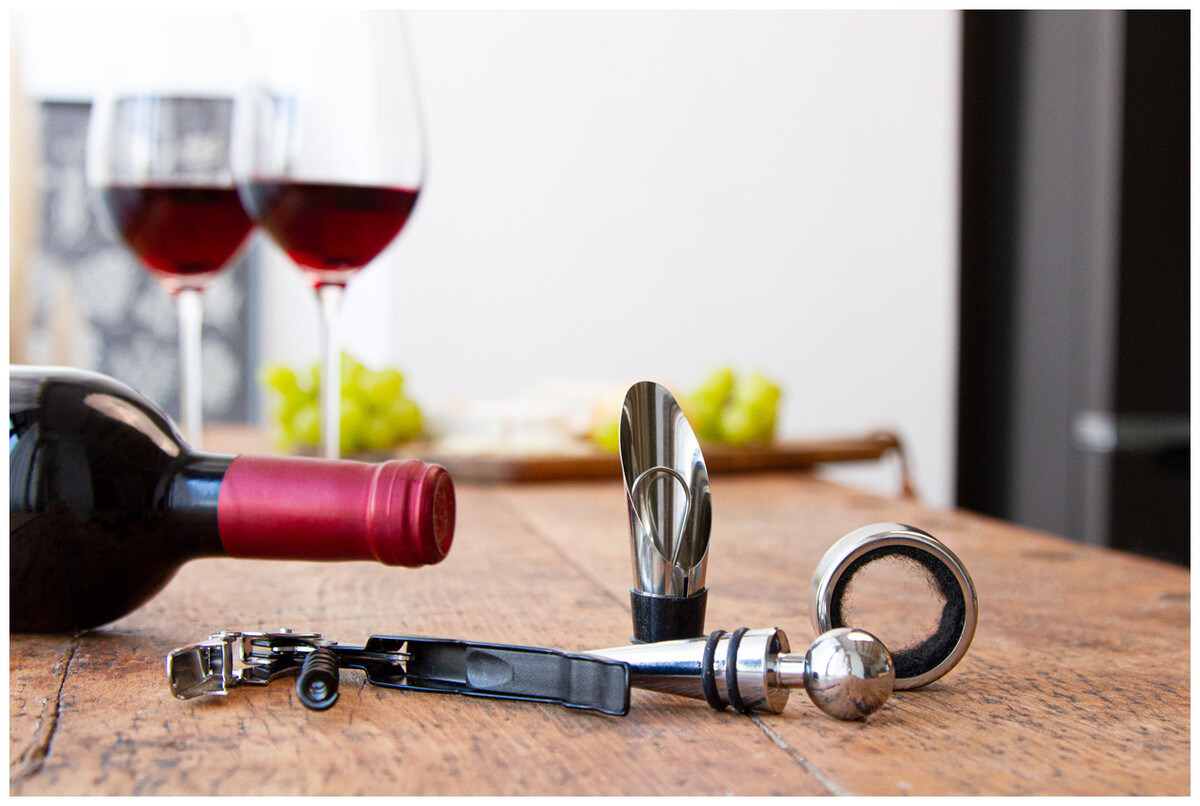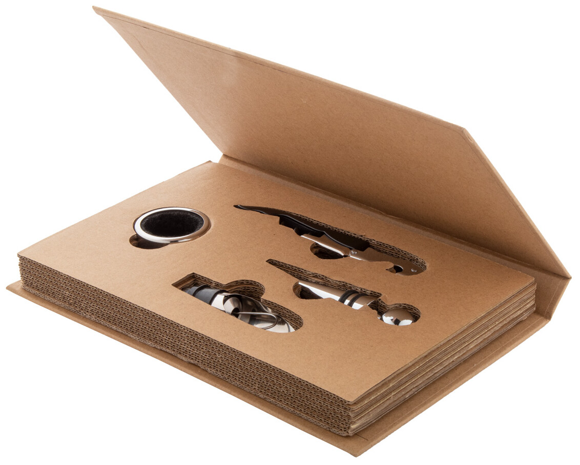 4dílná sada na víno z nerezové oceli v krabičce ve tvaru knihy z recyklovaného kraftového papíru. Včetně vývrtky, zátky, nálevky a kroužku na kapy.