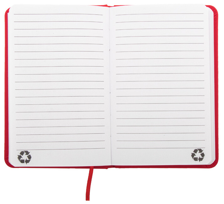 Blok potažený recyklovanou PU kůží se 100 linkovanými listy z recyklovaného papíru. Se záložkou v odpovídající barvě a gumičkou. Velikost A6.