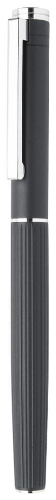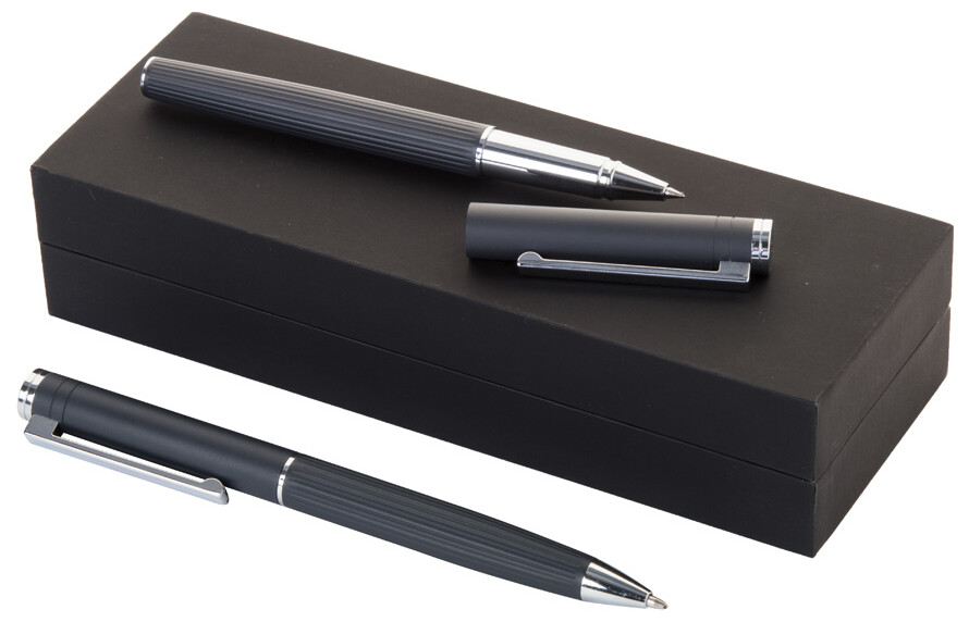Elegantní sada hliníkového kuličkového pera a rolleru s proužkovaným tubusem. V černé dárkové krabičce, s modrou náplní.