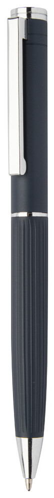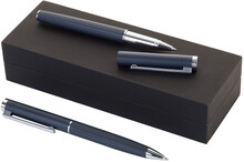 Elegantní sada hliníkového kuličkového pera a rolleru s proužkovaným tubusem. V černé dárkové krabičce, s modrou náplní.