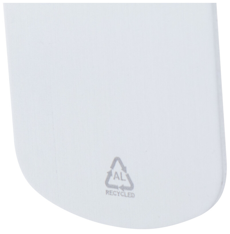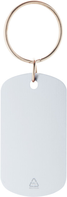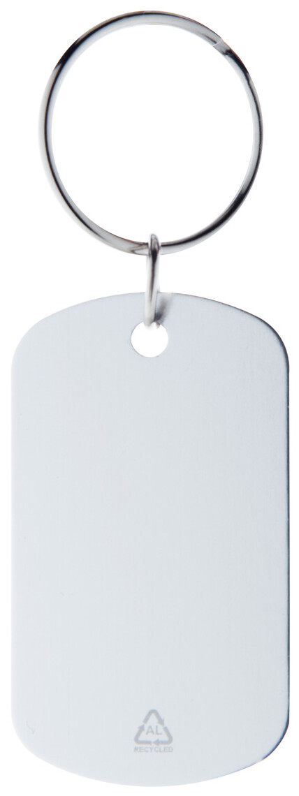 Přívěšek na klíče z recyklovaného hliníku s kovovým kroužkem.
