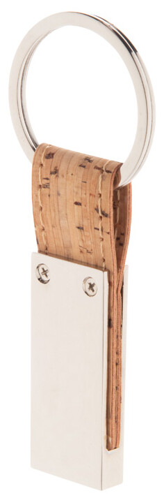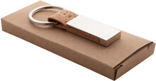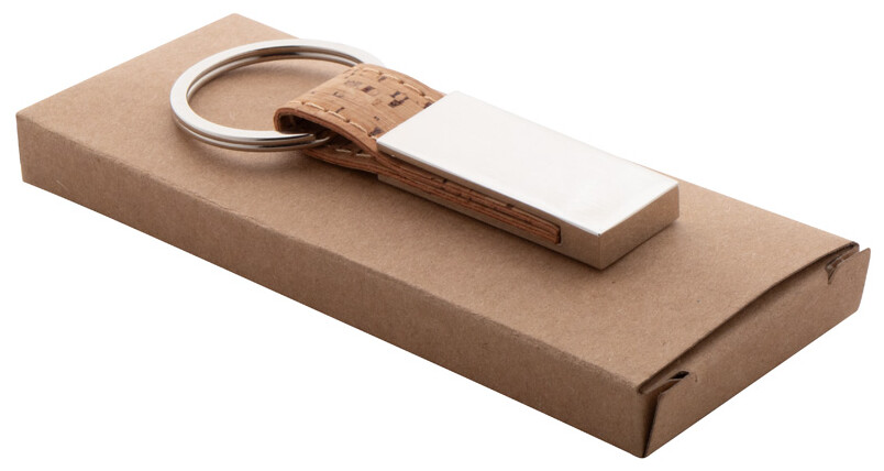 Obdélníkový kovový přívěsek na klíče s přírodním korkem a řemínkem z PU kůže. V kraftové papírové krabici.