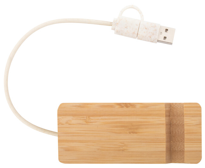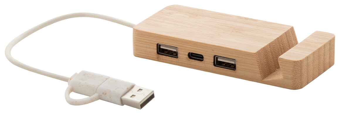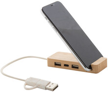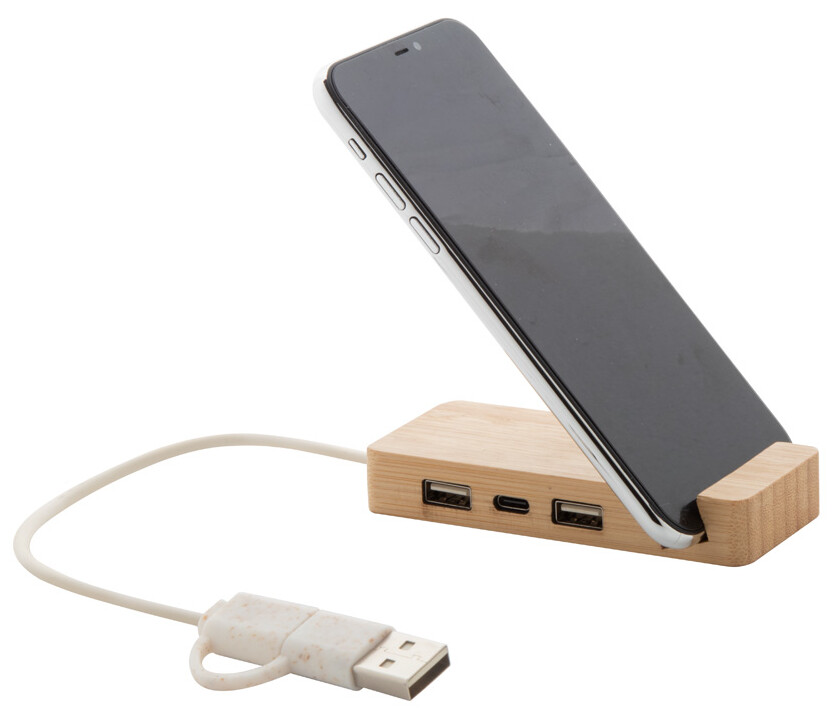 Bambusový USB hub s funkcí stojánku na mobil. Se 2 porty USB a 1 portem USB-C, USB 2.0. Včetně kabelu s připojením USB a USB-C.