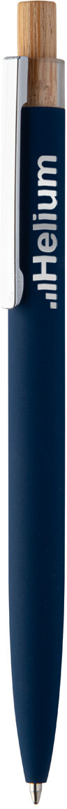 Kuličkové pero z recyklovaného hliníku s pogumovaným povrchem, bambusovým tlačítkem a chromovým klipem. Se speciální vrstvou pro zrcadlové laserové gravírování. S modrou náplní.