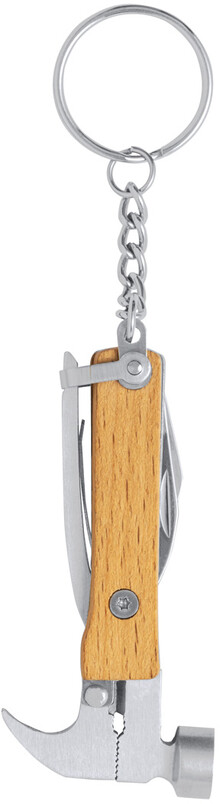 Multifunkční nářadí z nerezové oceli s dřevěnou rukojetí a 7 funkcemi. S kovovým kroužkem na klíče.