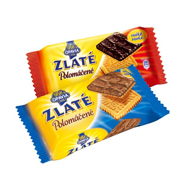Opavia Zlaté Polomáčené jsou tradiční sušenky z jedné strany polité lahodnou hořkou nebo mléčnou čokoládou. Balení 100 g.