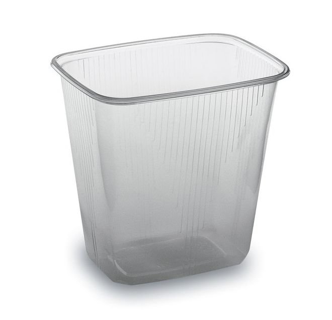 Klasická průhledná hranatá miska, vhodná k prodeji salátů, a dalších potravin.
