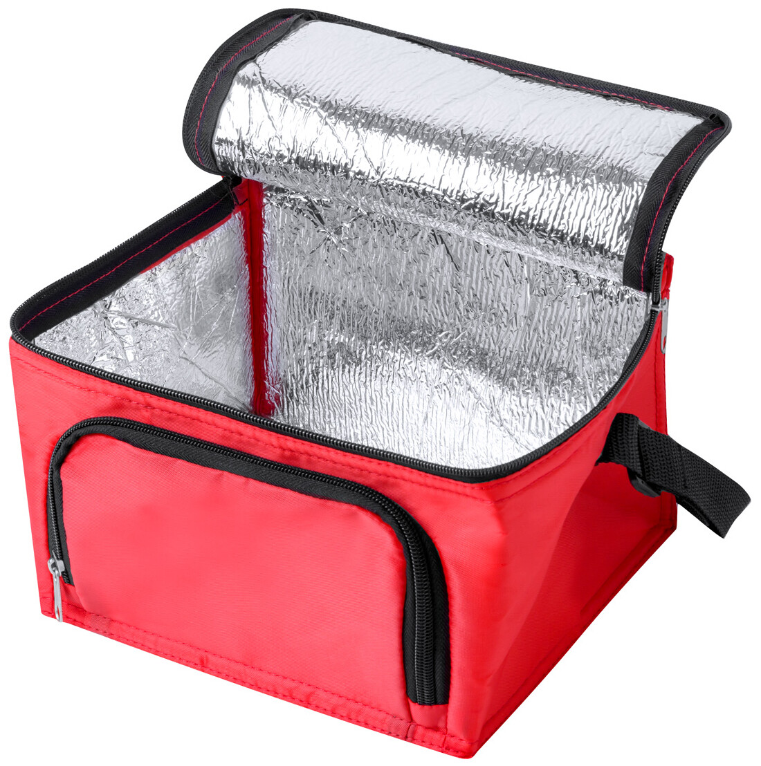 Polyesterová chladicí taška s přihrádkami na zip, hliníkovým polstrováním a ramenním popruhem. Pro 6 ks plechovek 0,33L. 210D polyester.