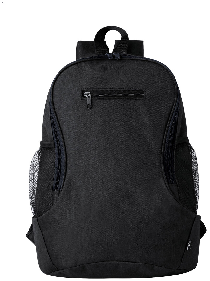 Batoh RPET s přihrádkou na zip a přední kapsou, boční síťované kapsy, polstrovaná záda a ramenní popruhy. 300D RPET polyester s výrazným štítkem RPET.
