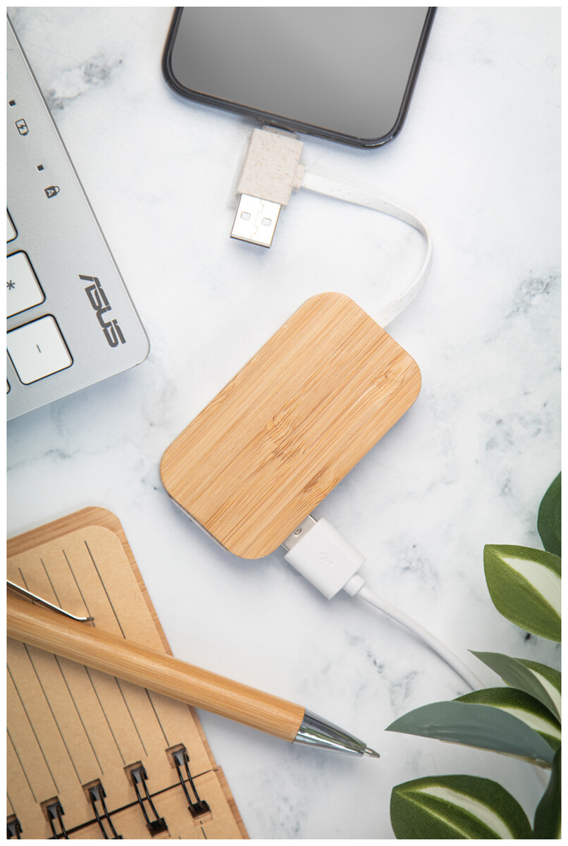 Plastový USB hub z bambusu a ekologické pšeničné slámy s funkcí stojánku na mobil. Se 2 USB a 2 USB-C porty, USB 2.0. Včetně kabelu s připojením USB a USB-C.