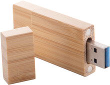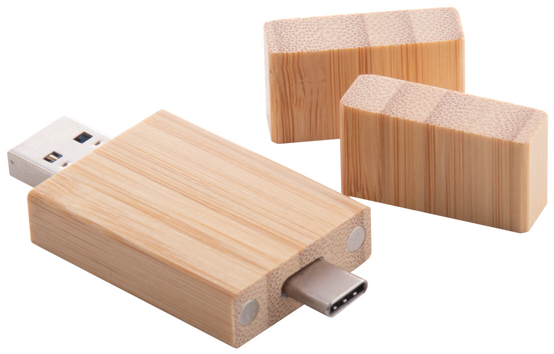 OTG USB flash disk v bambusovém pouzdře s pamětí 8/16/32 GB. S konektory USB a USB-C. V kraftovém papírovém sáčku. USB 2.0.