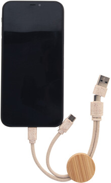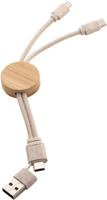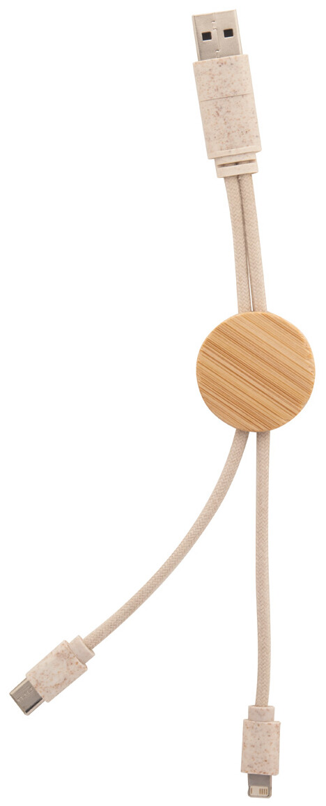 Ekologický USB nabíjecí kabel z pšeničné slámy, bavlny a bambusu s konektory micro USB, USB-C a Lightning. Se vstupy USB a USB-C.