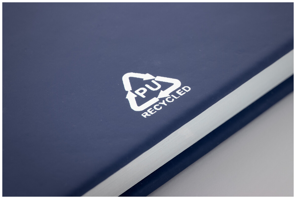 Blok A5 z recyklované PU kůže se 100 čistými listy z recyklovaného papíru. Se záložkou v odpovídající barvě a gumičkou.