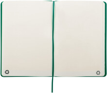 Blok A5 z recyklované PU kůže se 100 čistými listy z recyklovaného papíru. Se záložkou v odpovídající barvě a gumičkou.