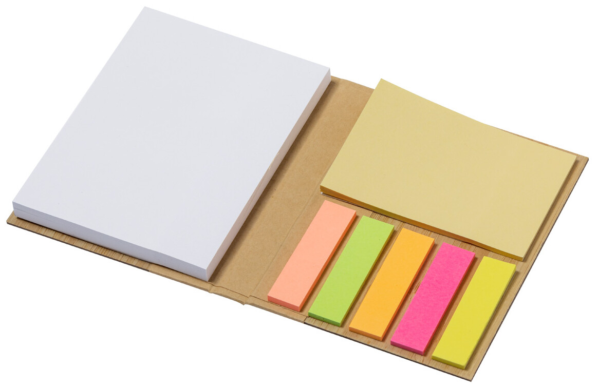 Poznámkový blok potažený bambusem se 70 listy, 25 lepicími papírky a 125 popisovači stránek (v 5 různých barvách).
