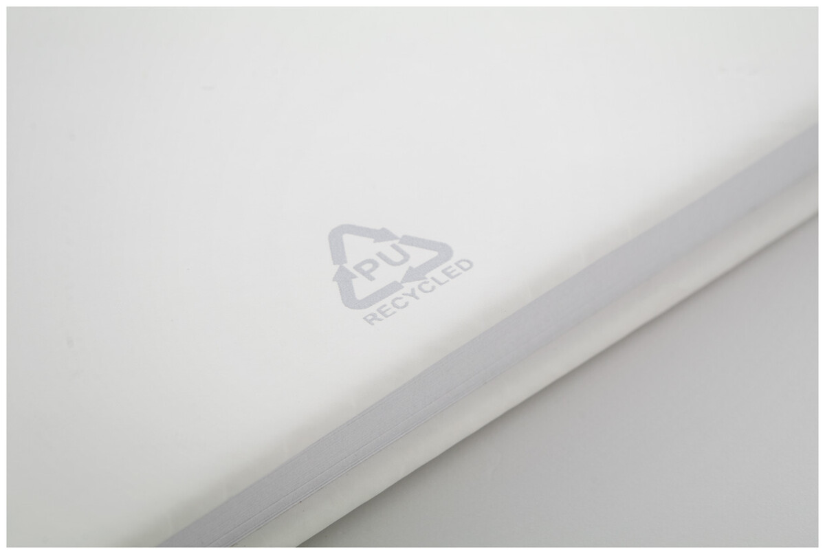Blok A6 z recyklované PU kůže se 100 čistými listy z recyklovaného papíru. Se záložkou v odpovídající barvě a gumičkou.