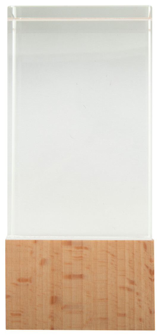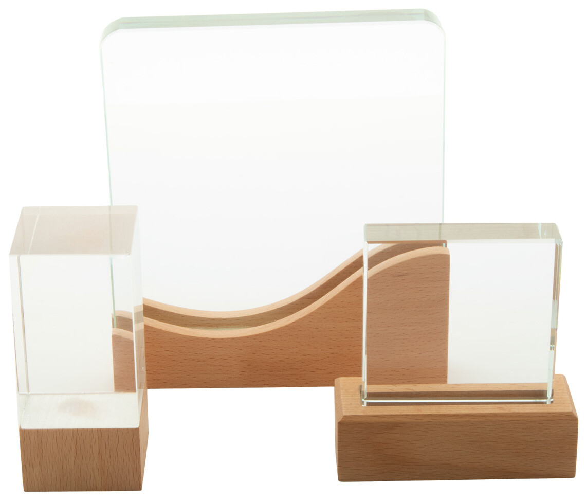 Skleněná trofej s podnoží z bukového dřeva. V kraftové dárkové krabičce.