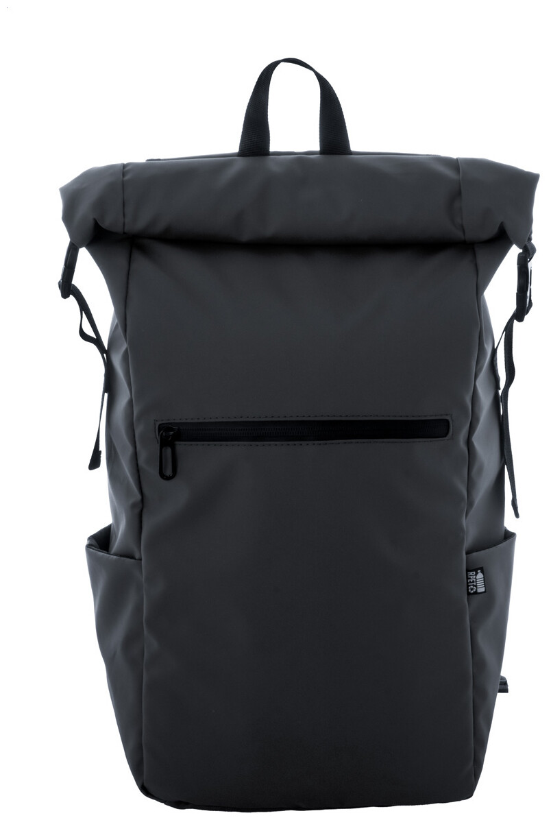 Vodotěsný rolovací batoh z RPET se zapínáním na přezku a suchý zip, polstrovaná přihrádka na notebook (16") a tablet (10"), přední kapsa na zip, boční kapsy, polstrovaná záda a ramenní popruhy. Polyester 600D RPET potažený PU, s výrazným štítkem RPET.