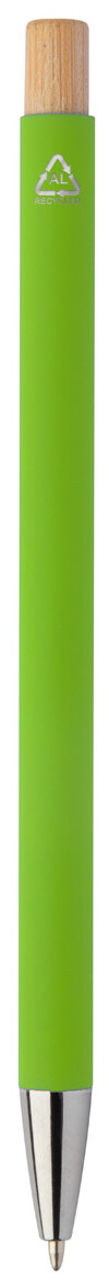 Kuličkové pero z recyklovaného hliníku s pogumovaným povrchem a bambusovým tlačítkem a chromovými detaily. Se speciální vrstvou pro zrcadlové laserové gravírování. S modrou náplní.