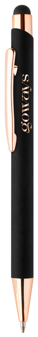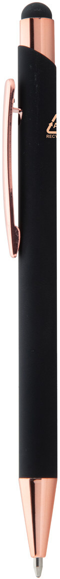Kuličkové a dotykové pero z recyklovaného hliníku s pogumovaným povrchem a detaily v barvě růžového zlata. Se speciální povrchovou úpravou pro zrcadlové laserové gravírování v barvě růžového zlata. S modrou náplní.