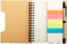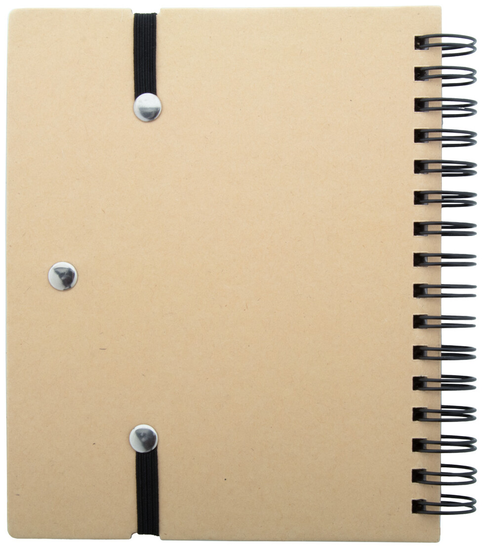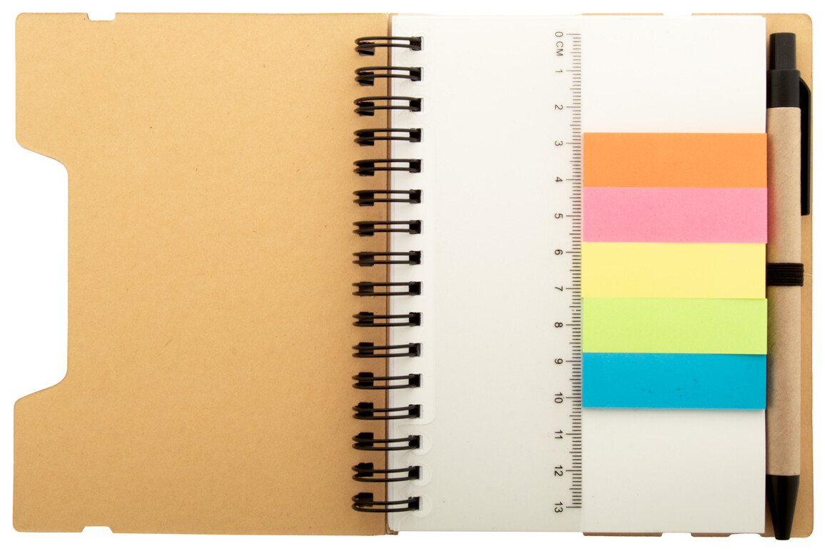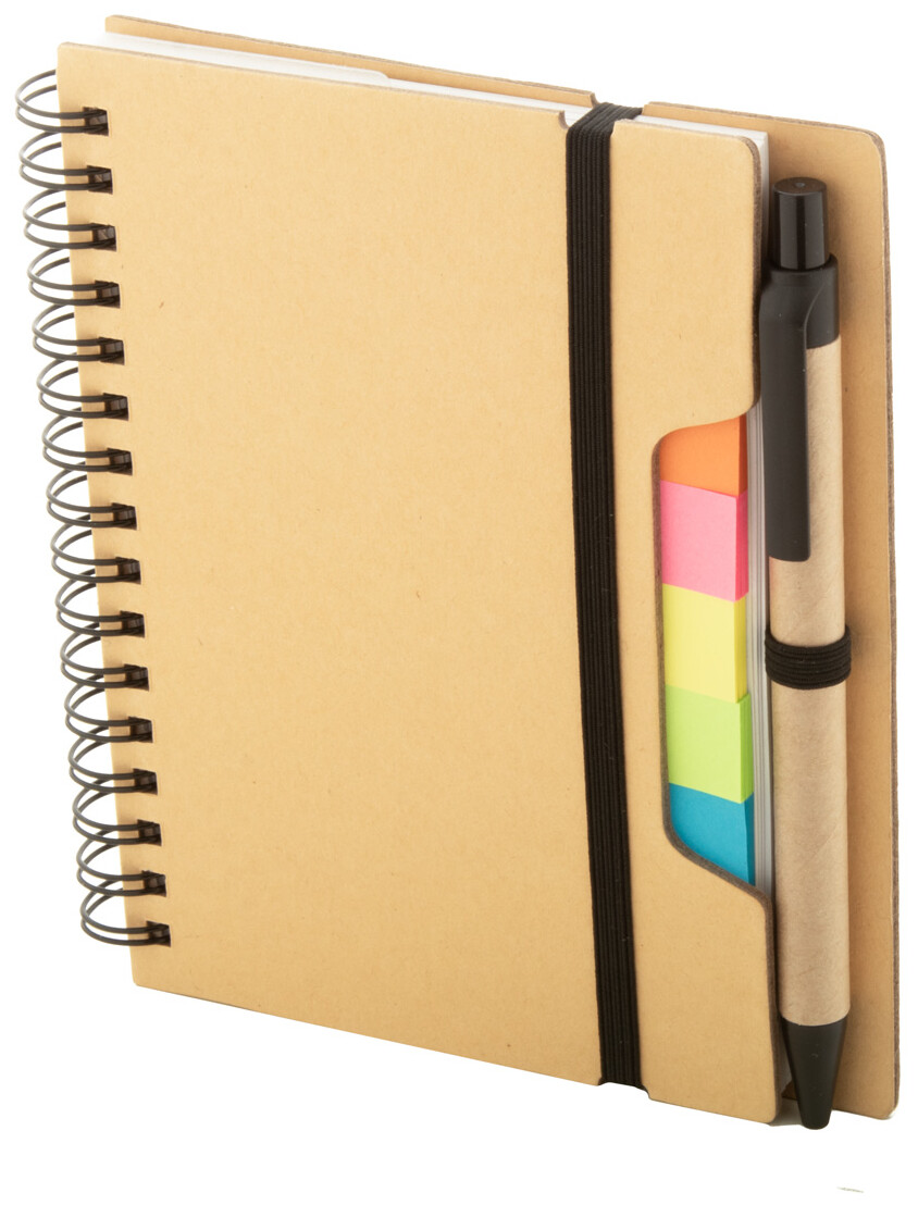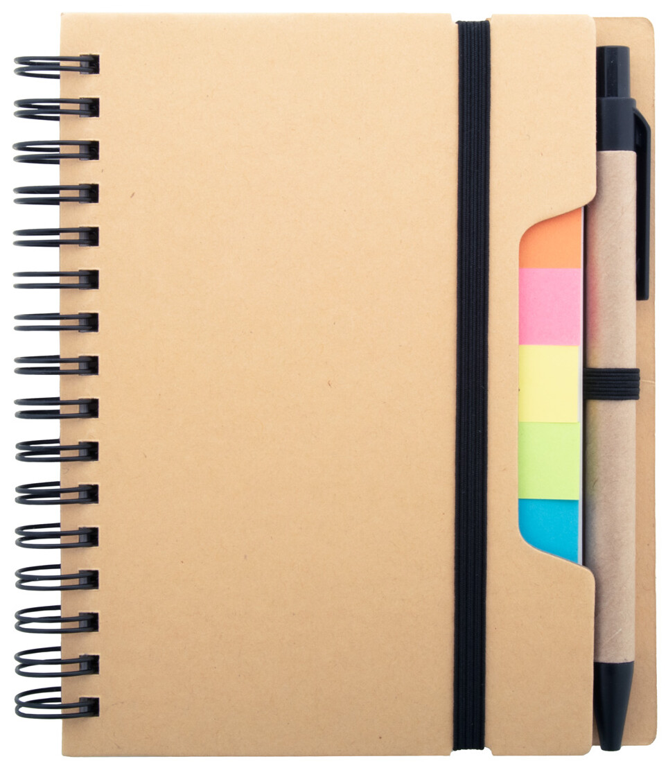 Spirálový blok A6 z recyklovaného papíru se 70 linkovanými listy a 125 popisovači stránek (v 5 různých barvách). S gumovým páskem a držákem na pero. Včetně kuličkového pera z recyklovaného papíru s modrou náplní.