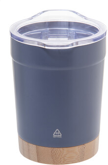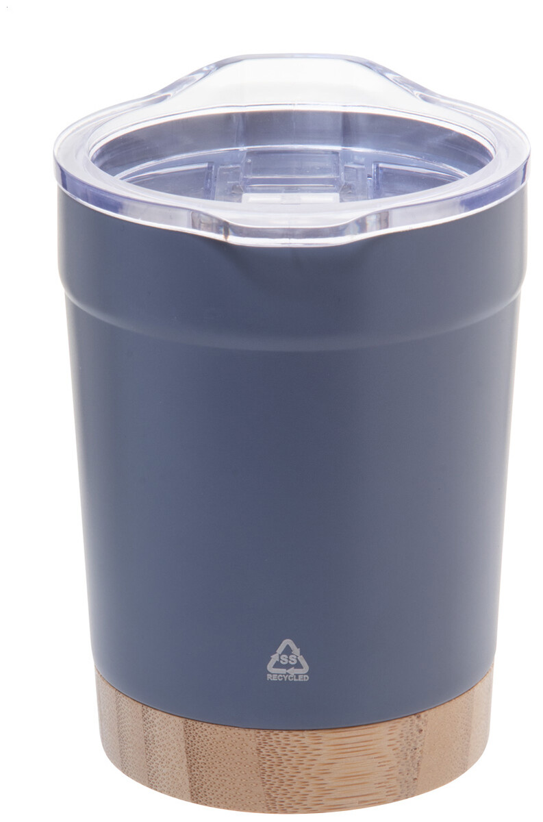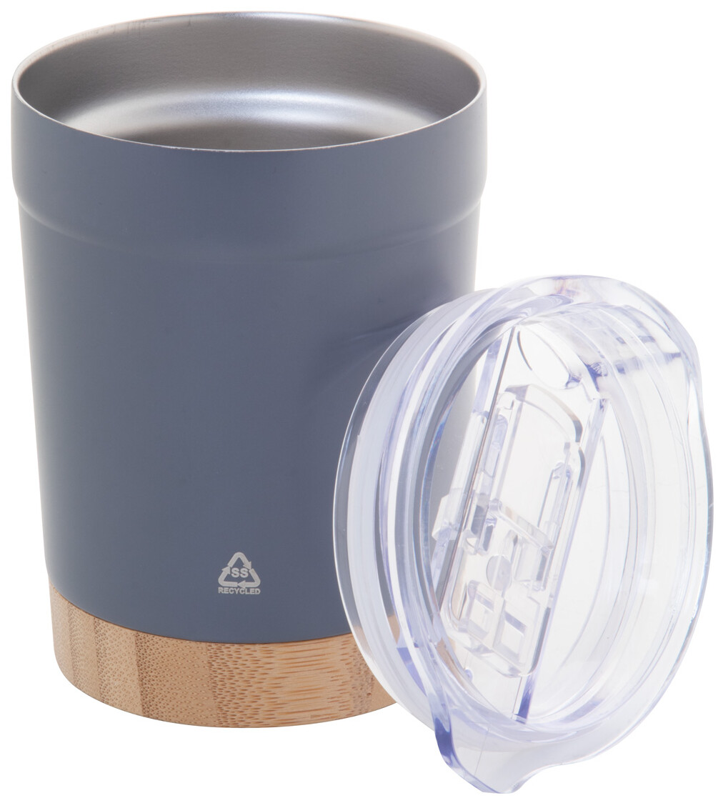 Dvoustěnný vakuově izolovaný termo hrnek z recyklované nerezové oceli s bambusovým dnem a AS plastovým víčkem na pití. 300 ml.