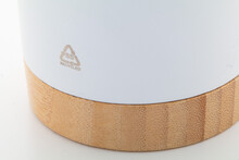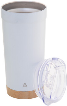 Dvoustěnný vakuově izolovaný termo hrnek z recyklované nerezové oceli s bambusovým dnem a AS plastovým víčkem na pití. 600 ml.