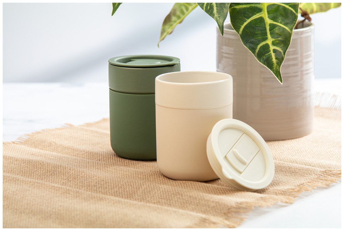Silikonem potažený keramický cestovní kelímek s PP plastovým odkapávacím víčkem. 300 ml.
