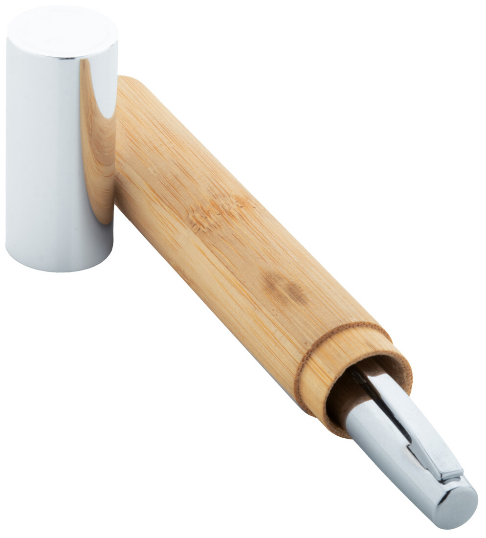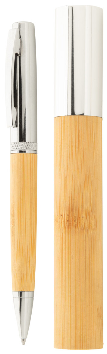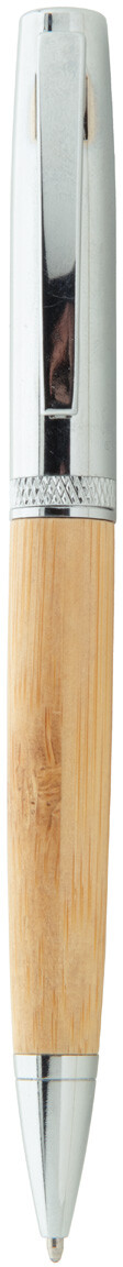 Elegantní kovové kuličkové pero s bambusovým tělem a lesklými chromovanými částmi. V bambusovém pouzdře s chromovým uzávěrem. S modrou náplní.