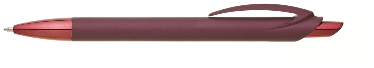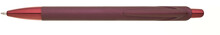 Červené plastové metalické tělo doplňují lesklé barevné doplňky. Velkoobsahová gelová náplň, modře píšící.