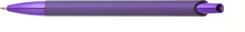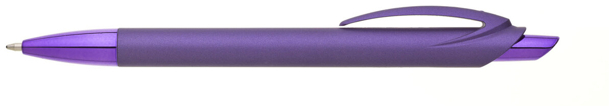 Fialové plastové metalické tělo doplňují lesklé barevné doplňky. Velkoobsahová gelová náplň, modře píšící.