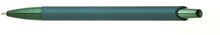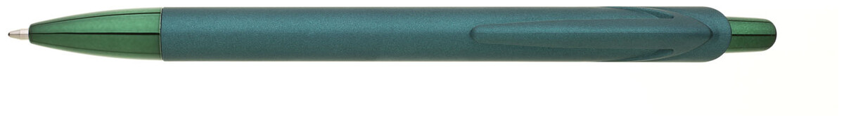 Zelené plastové metalické tělo doplňují lesklé barevné doplňky. Velkoobsahová gelová náplň, modře píšící.