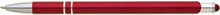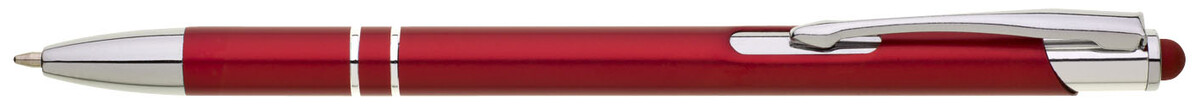 Tenká červená hliníková propiska s chromovými doplňky a touchem v barvě těla. Náplň X20 modře píšící.