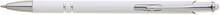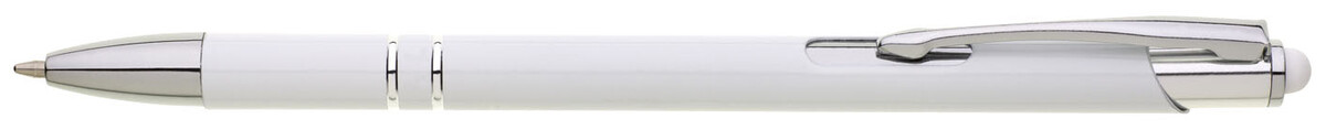 Tenká bílá hliníková propiska s chromovými doplňky a touchem v barvě těla. Náplň X20 modře píšící.