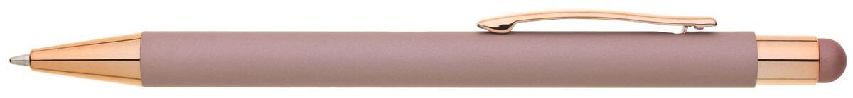 Růžové pogumované matné tělo propisky doplňují lesklé doplňky v barvě těla a matný touch konec. Logo po vylaserování je lesklé stříbrné. Velkoobsahová modře píšící náplň.