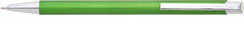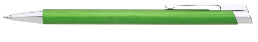 Zelená kovová propiska s jemně rýhovaným povrchem.