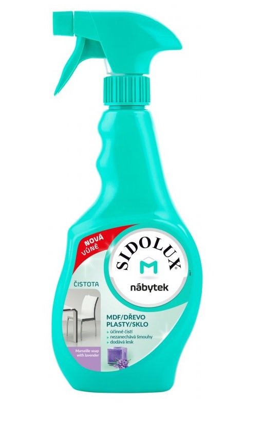 Čistící sprej na nábytek Sidolux M proti prachu je multifunkční rozprašovač vhodný na čištění hladkých povrchů v domácnostech. Prostředek je možné použít na dřevěné povrchy, plast, lakované povrchy, nerez a sklo. Dále je vhodný na čištění tvrdých ploch v interiérech automobilů – výplní dveří, palubních desek, apod. Obsažená vonná kompozice příjemně provoní čištěný prostor.
