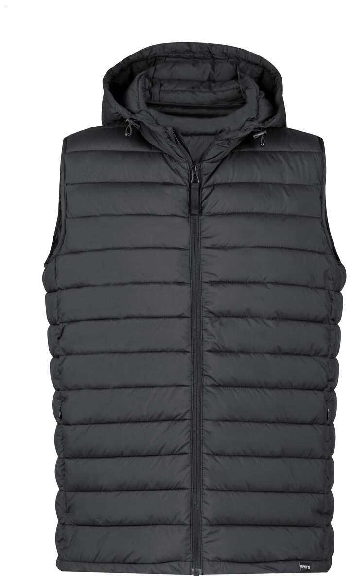 Větru a vodě odolná vesta na zip s bočními kapsami na zip a nastavitelnou kapucí. S polyesterovým pouzdrem RPET. 100% RPET polyester s výrazným štítkem RPET.